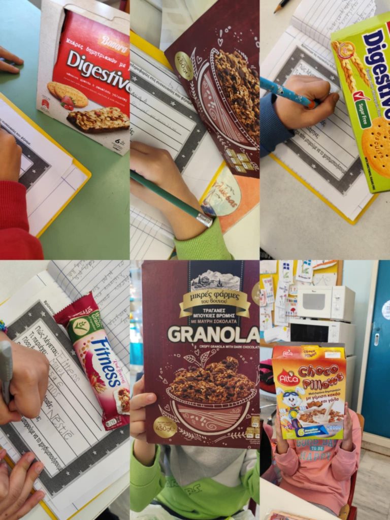 Οι μαθητές της Β’ τάξης έφεραν στην τάξη συσκευασίες από διάφορα προϊόντα. Σε ομάδες μελέτησαν τις ετικέτες και κατέγραψαν σε έναν κατάλογο την ονομασία του προϊόντος, τι περιέχει η συσκευασία, πόσο βαριά είναι, την ημερομηνία παραγωγής και λήξης και την εταιρεία που το κατασκεύασε. Προηγήθηκε μοντελοποίηση της παρουσίασης των στοιχείων μιας συσκευασίας από την εκπαιδευτικό και, ύστερα από την καταγραφή του καταλόγου από τους μαθητές, ακολούθησε η παρουσίαση των καταλόγων τους. Ακόμα, έγινε σχετική συζήτηση και για τον πίνακα που αναφέρονται τα συστατικά των προϊόντων.